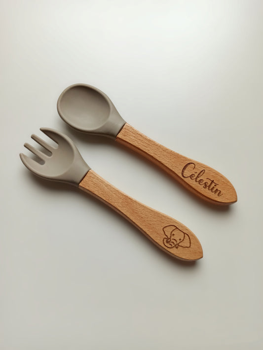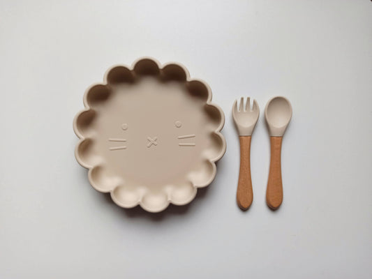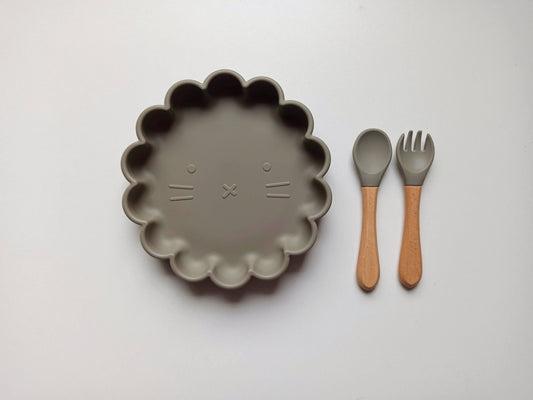Set repas bébé Fleur et couverts personnalisés Taupe